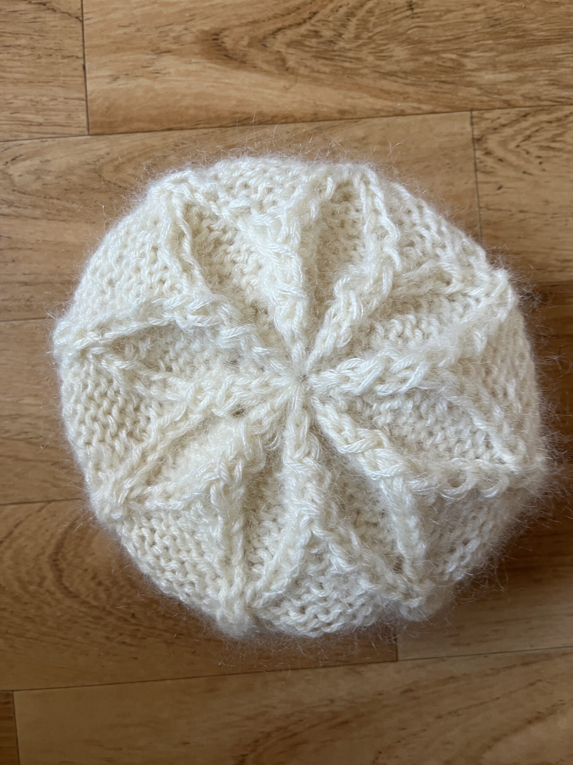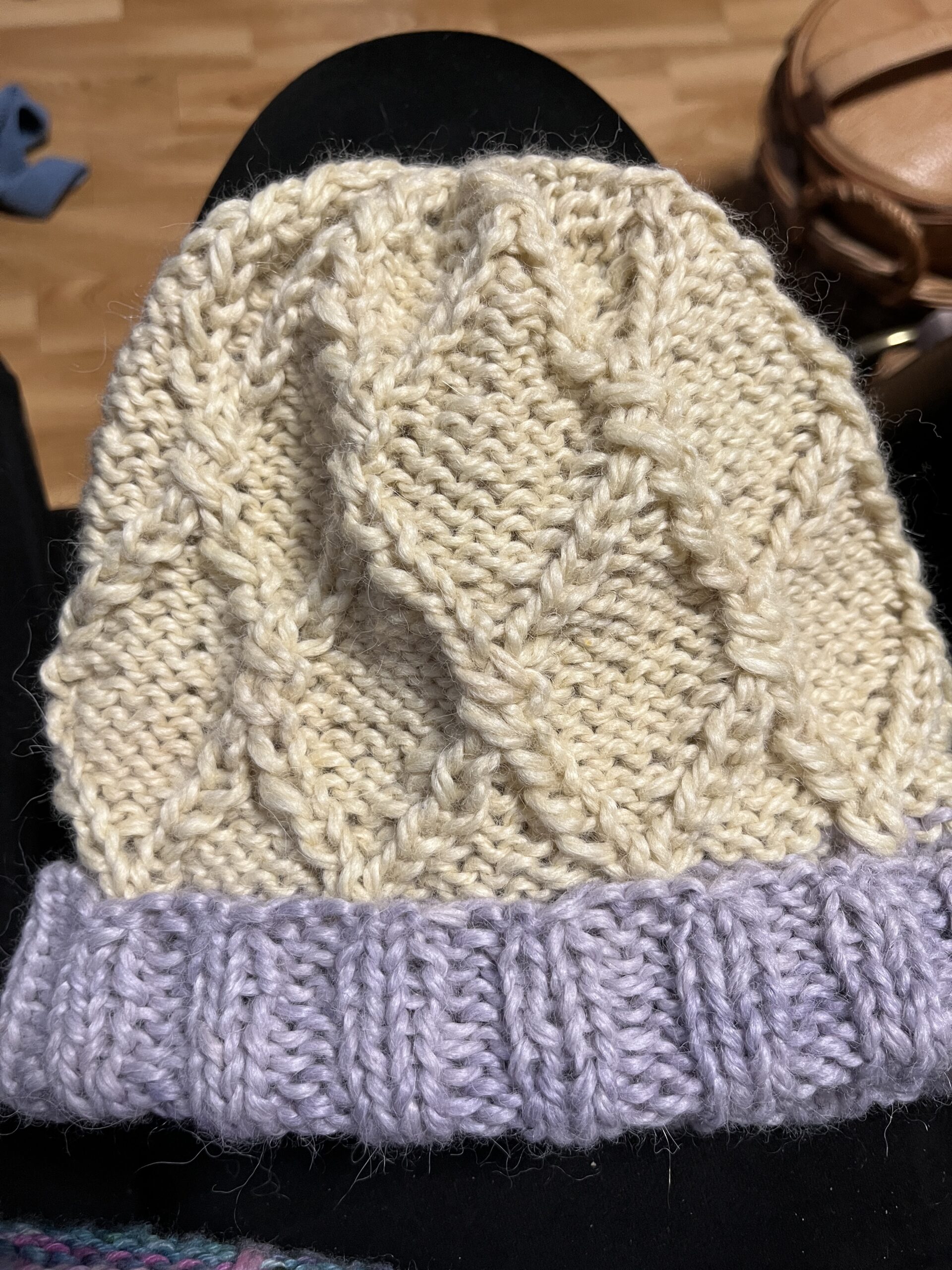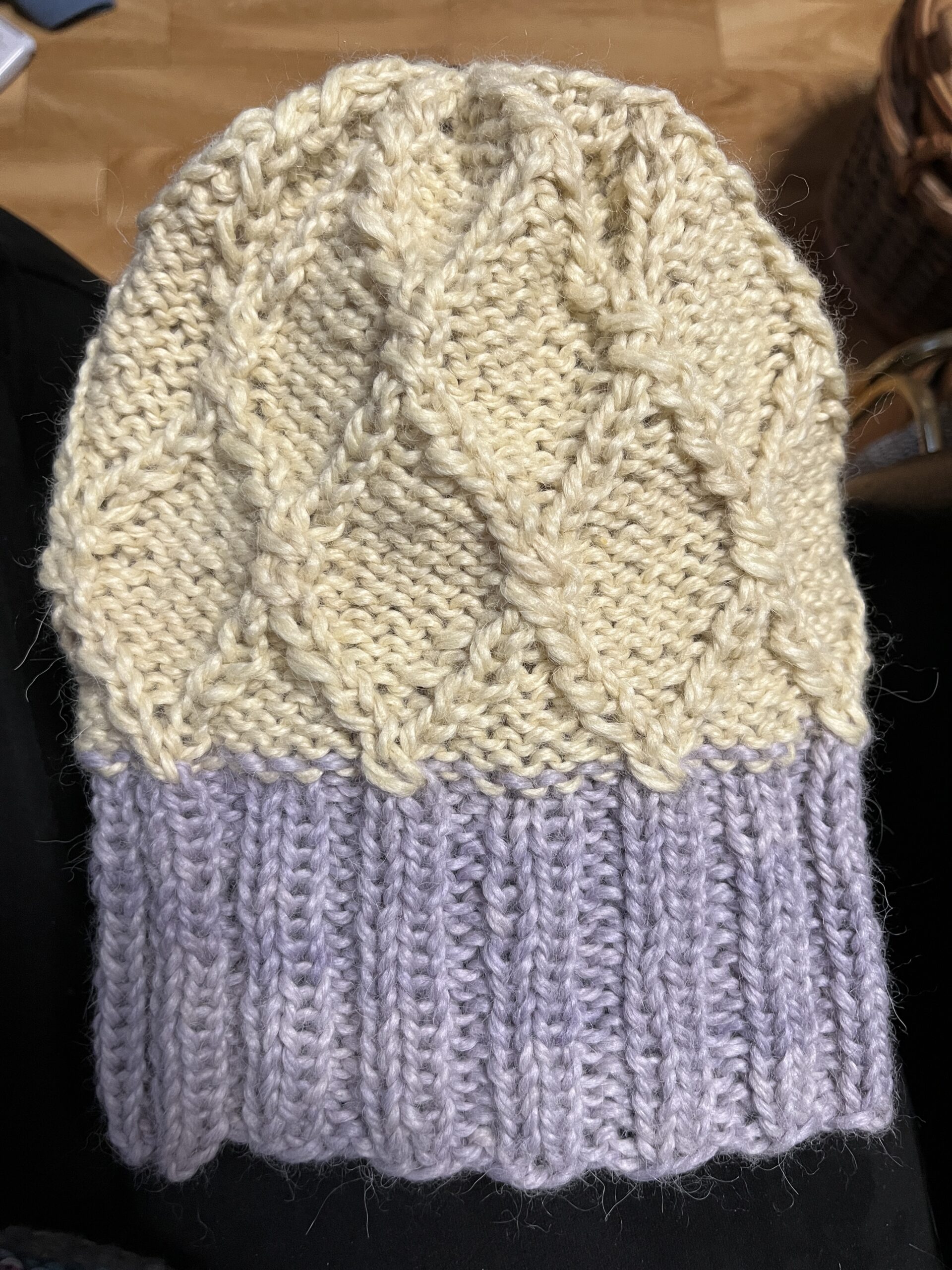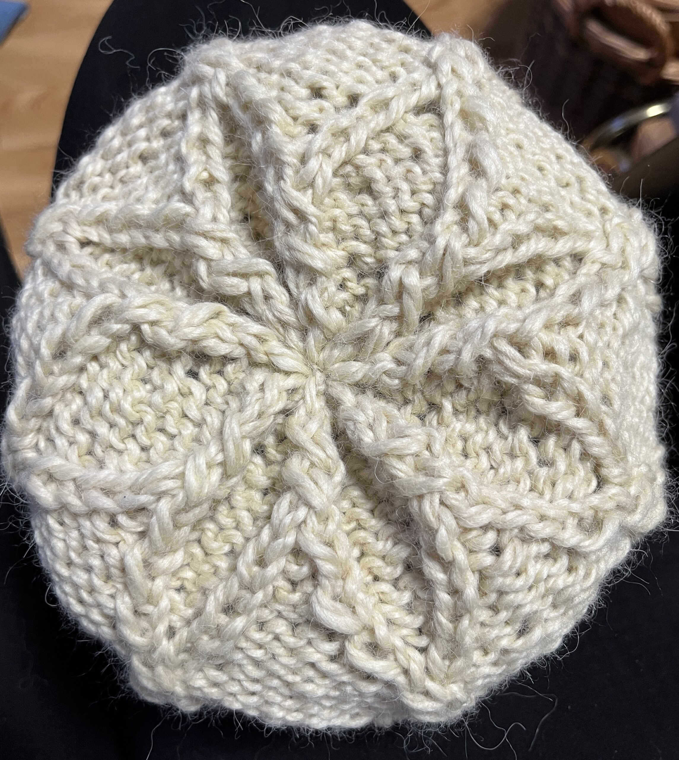Ce bonnet en taille adulte se tricote en circulaire aux aiguilles 7, en partageant de la bordure vers le sommet. Comme une danse, les mailles croisées forment un quadrillage qui se transforme en étoile au sommet.