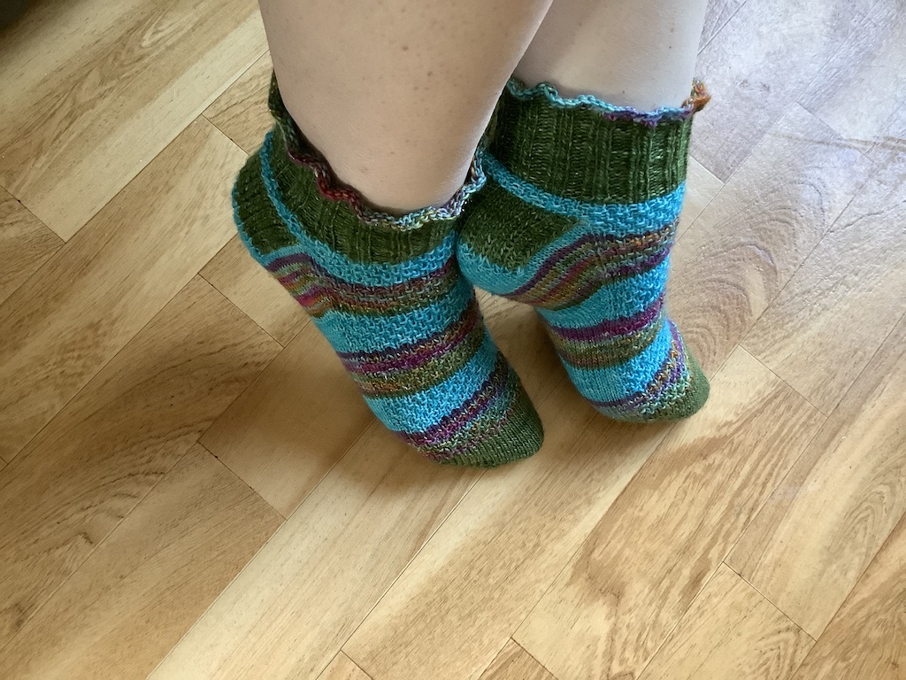 Ce modèle a été créé pour utiliser des restes de fils mais il peut être tricoté d’une seule couleur. La tige est en côtes fantaisie dentelle se terminant avec un légère collerette.